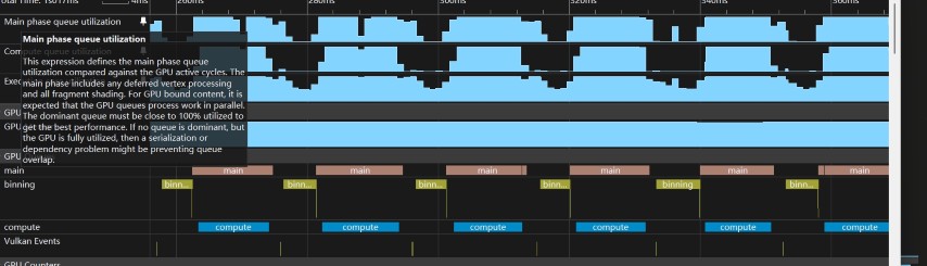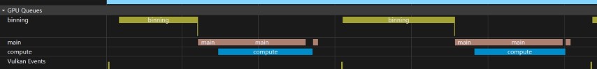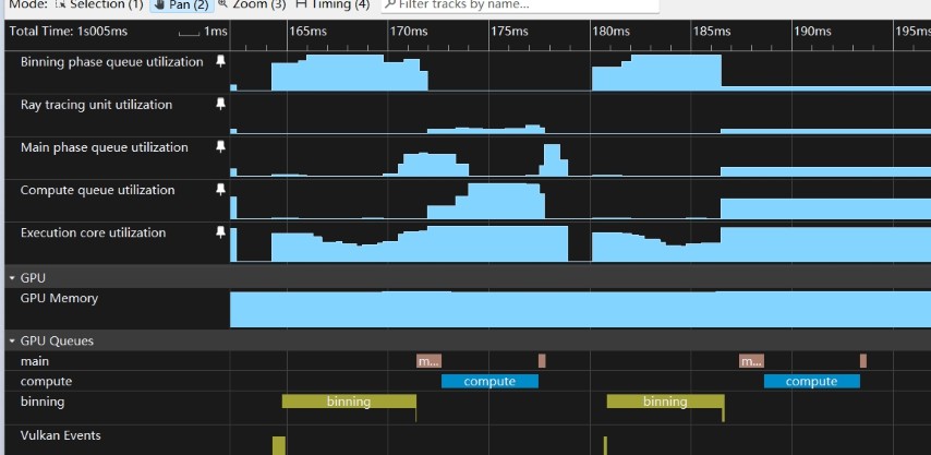 Inspecting the GPU queue timeline in AGI confirmed that the compute and graphics queues do overlap in time. The RT Compute Pass and the Heavy Fragment Pass appeared to execute concurrently.